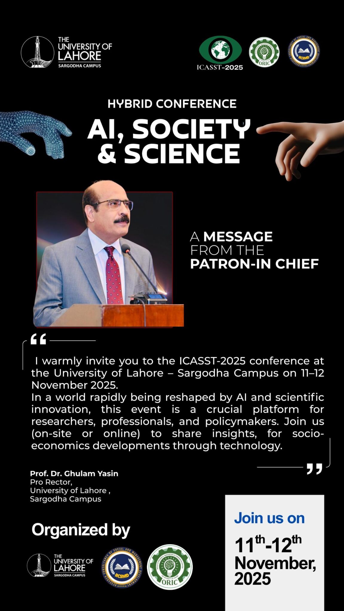The 2nd International Conference on Artificial Intelligence, Social Transformation, and Scientific Progress (ICASST-2025) will be held on 11–12 November 2025 at the University of Lahore – Sargodha Campus in hybrid mode (on-site & online participation).